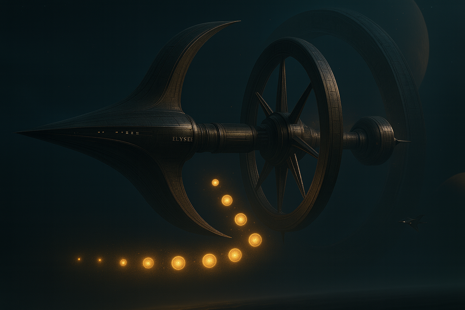 Die Helios näherte sich weiter der Elysée. In demselben Moment teilte sich der Lichtpunkt in neun kleinere Lichter. Sie legten sich als Spirale um die Elysée und öffneten einen Korridor im Raum — gerade groß genug für genau ein Schiff.