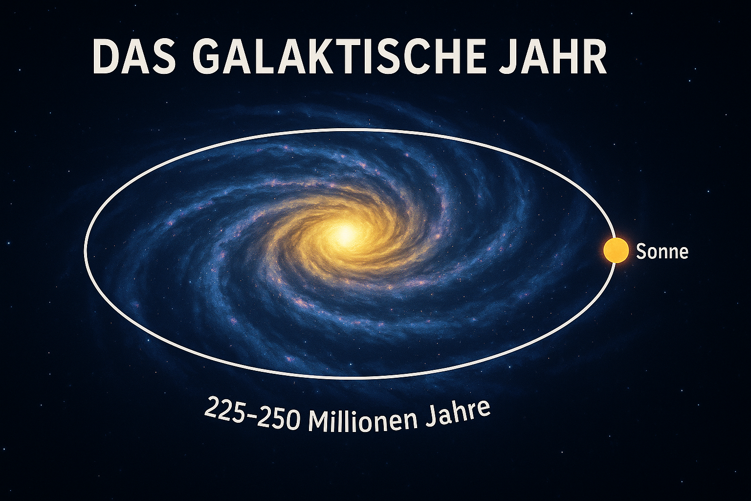 Wenn wir von Zeit sprechen, denken wir an Sekunden, Minuten, Stunden und Jahre. Ein Jahr ist für uns die Zeit, die die Erde braucht, um einmal die Sonne zu umrunden. Doch diese Sonne sitzt nicht still im Weltraum: Sie selbst umkreist das Zentrum unserer Galaxie, der Milchstraße. Für diese riesige Bahn gibt es ebenfalls eine „Umlaufzeit“ – das nennt man ein galaktisches Jahr.