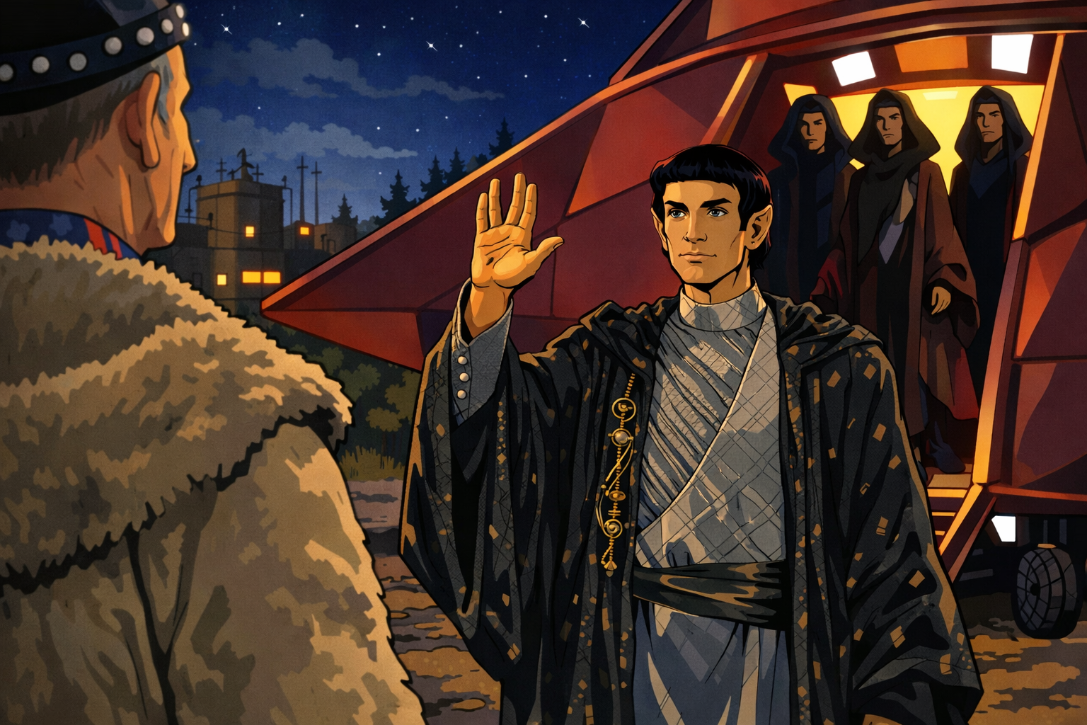 Dann erscheint ein fremdes Objekt am Himmel. Ein Schiff. Ein Raumschiff. Es kommt nicht als Feind. Es landet ruhig. Die Luke öffnet sich. Ein großer, schlanker Fremder tritt heraus, mit spitzen Ohren, scharf geschnittenem Gesicht und einer Haltung, die zugleich kühl und friedlich wirkt. Er hebt die Hand zu einem Gruß, den dort noch niemand kennt. Das Warp-Signal der Phoenix ist bemerkt worden. So kommt es in Bozeman am 5. April 2063 zum ersten Kontakt zwischen Menschen und Vulkaniern.